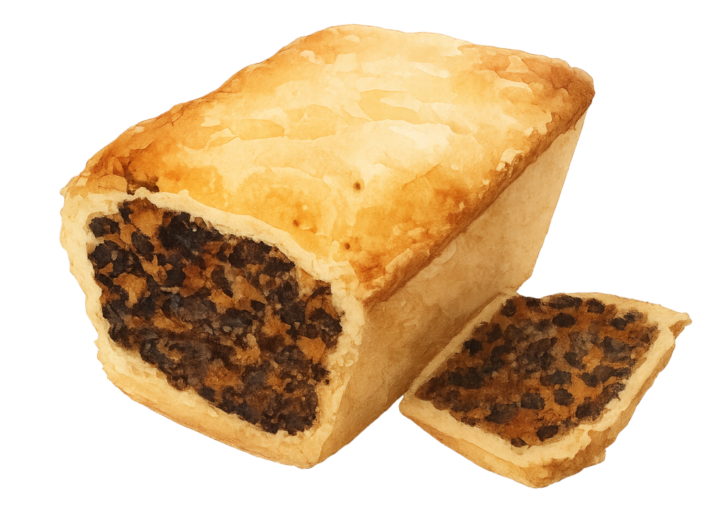 Снаружи он выглядит так, как мог бы выглядеть какой-нибудь мясной пирог — бедный родственник йоркширского рождественского пирога (которому в книге посвящена отдельная глава). Кажется, под оболочкой из рубленого тесто должна скрываться дичь. Но на самом деле вся дичь тут в том, что, разрезав этот пирог, вы обнаружите… по сути, очередной фруткейк, хоть и не вполне типичный.